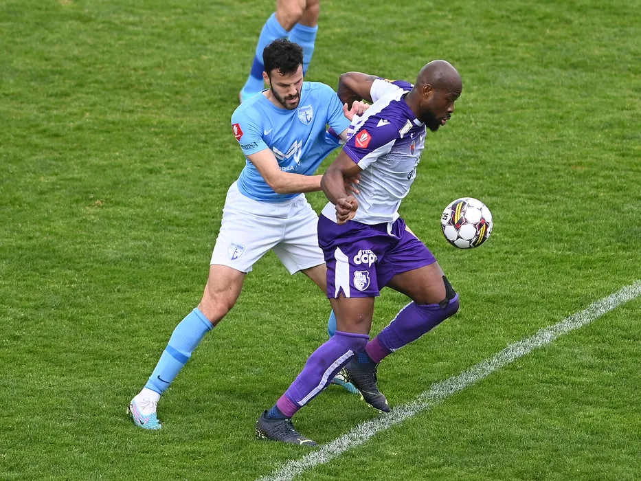 Patricio Martin Matricardi si Paul Arnold Garita in meciul de fotbal dintre FC Arges si FC Voluntari, contand pentru Play-out-ul Superligii Superbet, desfasurat pe Stadionul Nicolae Dobrin din Pitesti, duminica 2 aprilie 2023. © FOTO:Razvan Pasarica/SPORT PICTURES