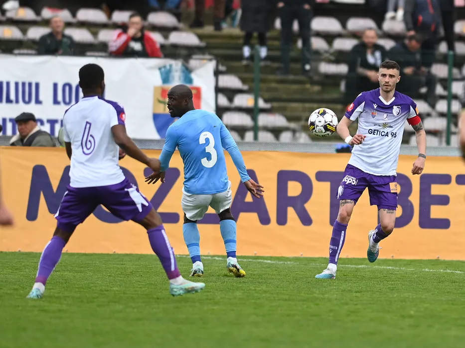 Ulrich Sidoine Melekesi Alin Dobrosavlevici in meciul de fotbal dintre FC Arges si FC Voluntari, contand pentru Play-out-ul Superligii Superbet, desfasurat pe Stadionul Nicolae Dobrin din Pitesti, duminica 2 aprilie 2023. © FOTO:Razvan Pasarica/SPORT PICTURES