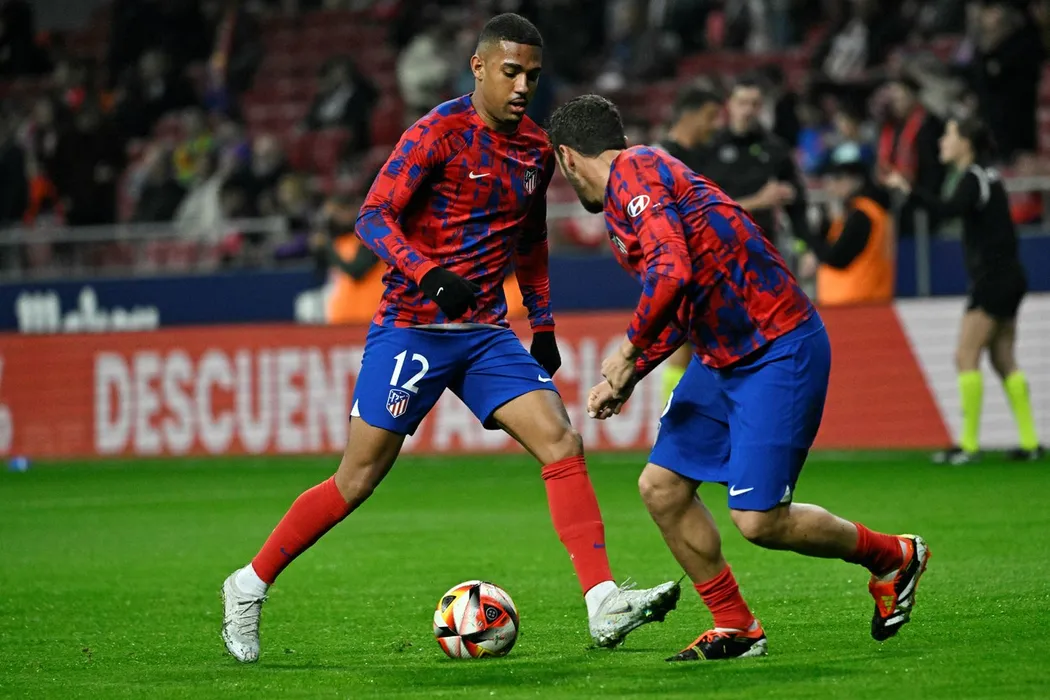Atletico Madrid's Brazilian forward #12 Samuel Lino (L) warms up prior the Spanish Copa del Rey (King's Cup) quarter final football match between Club Atletico de Madrid and Sevilla FC at the Metropolitano stadium in Madrid on January 25, 2024.,Image: 840559133, License: Rights-managed, Restrictions: , Model Release: no