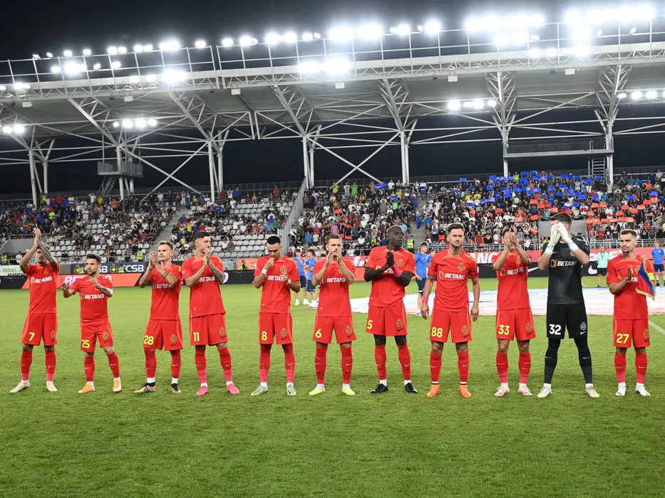 Fotbalistii stelisti la startul meciului de fotbal dintre FCSB si Dinamo Bucuresti, din cadrul Superligii Superbet, desfasurat pe Stadionul National Arcul de Triumf din Bucuresti, sambata 22 iulie 2023. © FOTO:Razvan Pasarica/SPORT PICTURES