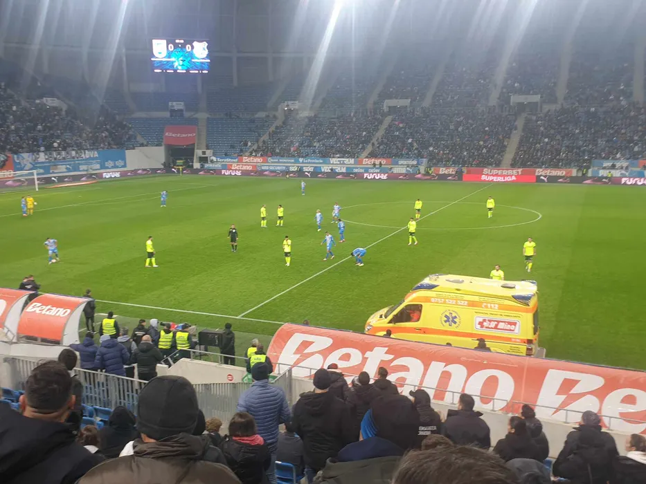 Momente de panică pe stadionul Ion Oblemenco: medicii de pe salvare, chemați să intervină de urgență în Peluza Nord Craiova! Meciul a fost întrerupt câteva minute de Kovacs