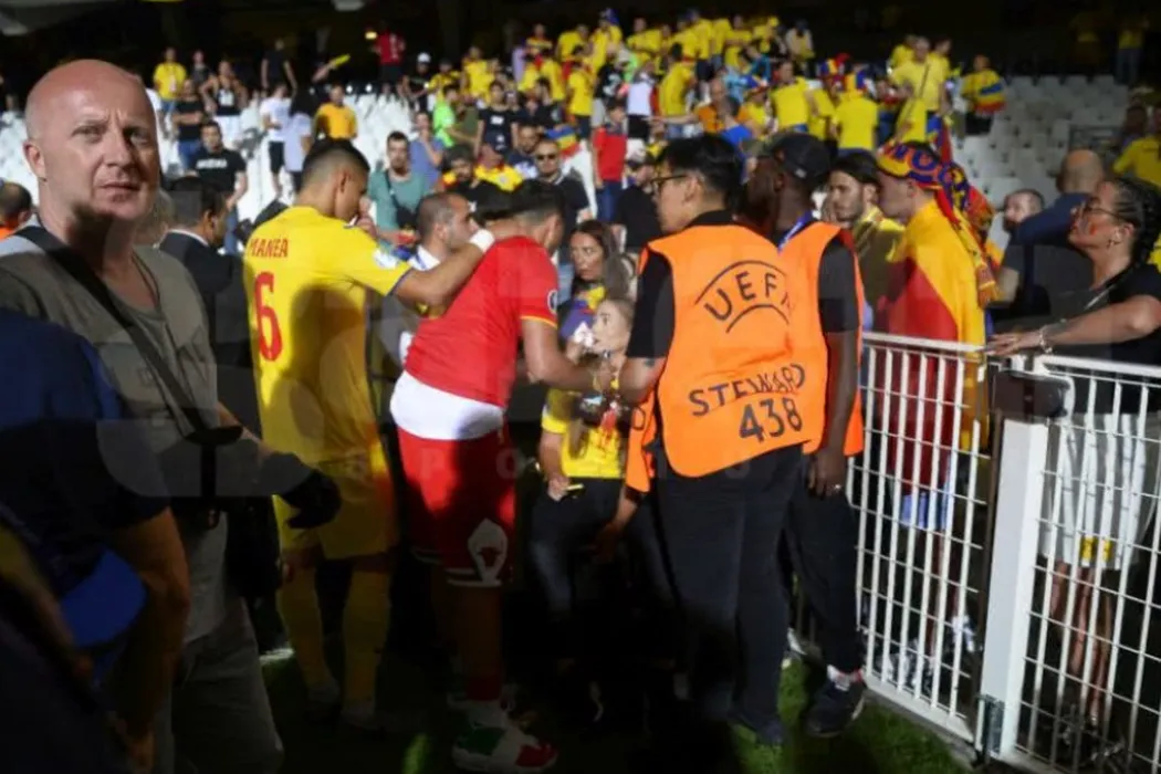 Momente halucinante la finalul partidei România – Franța: Cristi Manea a bruscat o fană, iar soția jucătorului a fost lovită cu piciorul în gură de un suporter român. Fotbalistul a intervenit, dar Gică Hagi i-a cerut să plece la vestiare