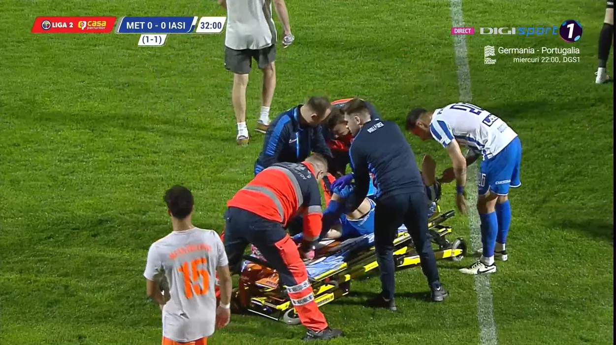 Momente horror la barajul Metaloglobus – Poli Iași! S-a ciocnit cu un adversar și și-a zdrobit genunchiul: și-a pus mâinile la ochi ca să nu vadă și ambulanța l-a dus de urgență la spital