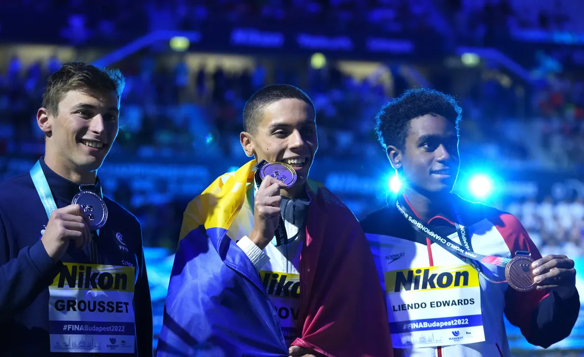 Silver medalist Maxime Grousset of France, left, gold medalist David Popovici of Romania, centre, bronze medalist Joshua Liendo Edwards of Canada, right, pose with their medals after the Men 100m Freestyle final at the 19th FINA World Championships in Budapest, Hungary, Wednesday, June 22, 2022. (AP Photo/Petr David Josek)