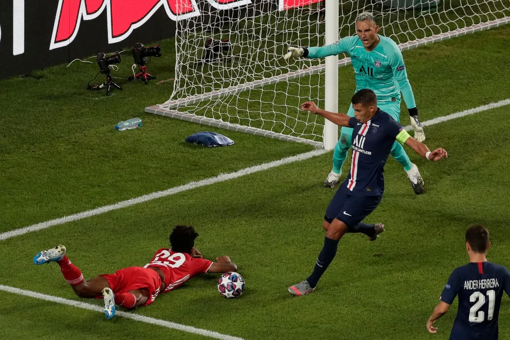 Bayern Munich's French forward Kingsley Coman (L) falls after he outrunned Paris Saint-Germain's German defender Thilo Kehrer (not in picture) in the penalty area during the UEFA Champions League final football match between Paris Saint-Germain and Bayern Munich at the Luz stadium in Lisbon on August 23, 2020.,Image: 554662491, License: Rights-managed, Restrictions: , Model Release: no