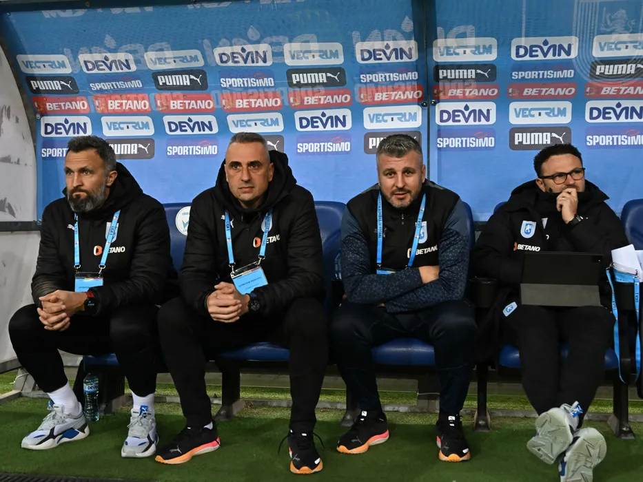 Banca craioveana cu Bogdanov Ivaylo Petev, Ionuț Stancu si Emil Pieleanu la meciul de fotbal dintre Universitatea Craiova si Rapid Bucuresti, contând pentru Superliga Superbet, desfășurat pe Stadionul Ion Oblemenco din Craiova, luni 4 martie 2024. © FOTO: Răzvan PĂSĂRICĂ/SPORT PICTURES