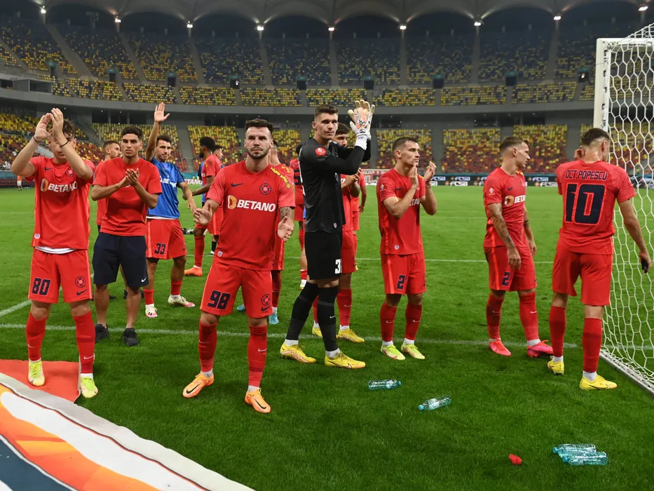 Fotbalistii stelisti Marco Alexandru Dulca, Andrei Ioan Cordea, Stefan Tarnovanu si Darius Dumitru Olaru saluta galeria dupa meciul de fotbal dintre FCSB si FC Hermannstadt, contand pentru Superliga Superbet, desfasurat pe Arena Nationala din Bucuresti, duminica 28 august 2022. © FOTO:Razvan Pasarica/SPORT PICTURES