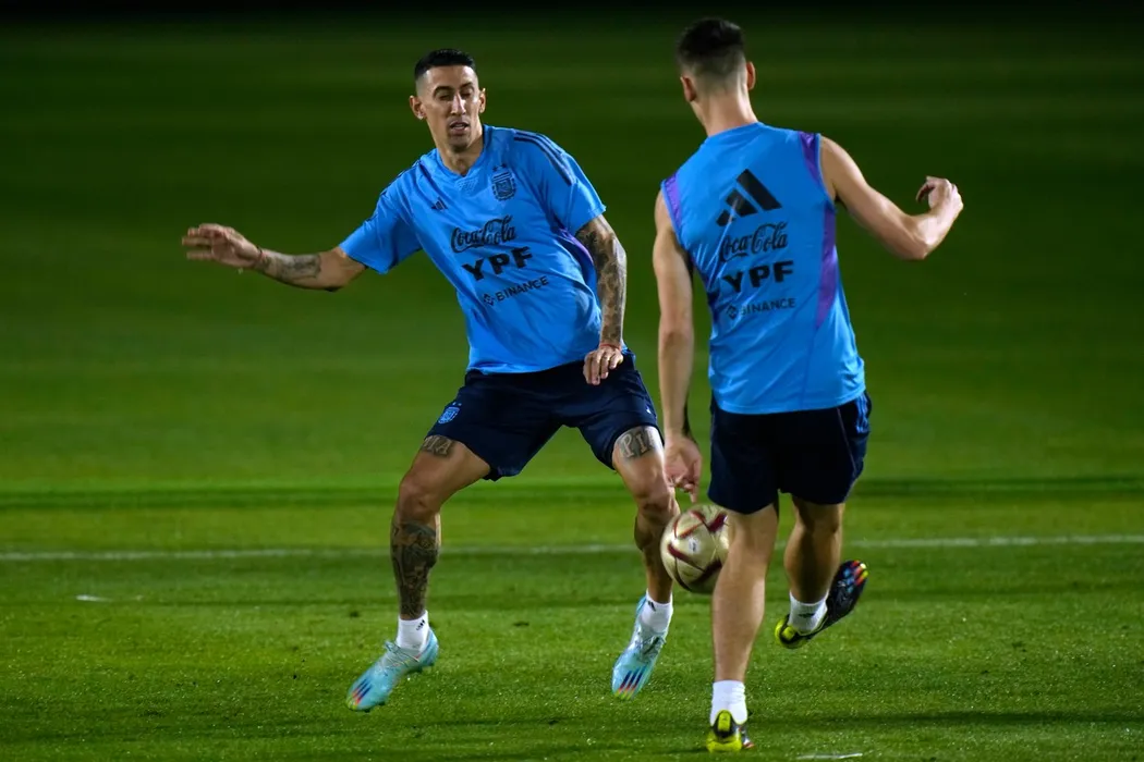 Argentina's Angel Di Maria plays the ball with a teammate during a training session of Argentina national team ahead of the final soccer match between Argentina and France in Doha, Qatar, Thursday, Dec. 15, 2022.,Image: 744823485, License: Rights-managed, Restrictions: This content is intended for editorial use only. For other uses, additional clearances may be required., Model Release: no, Pictured: Angel Di Maria