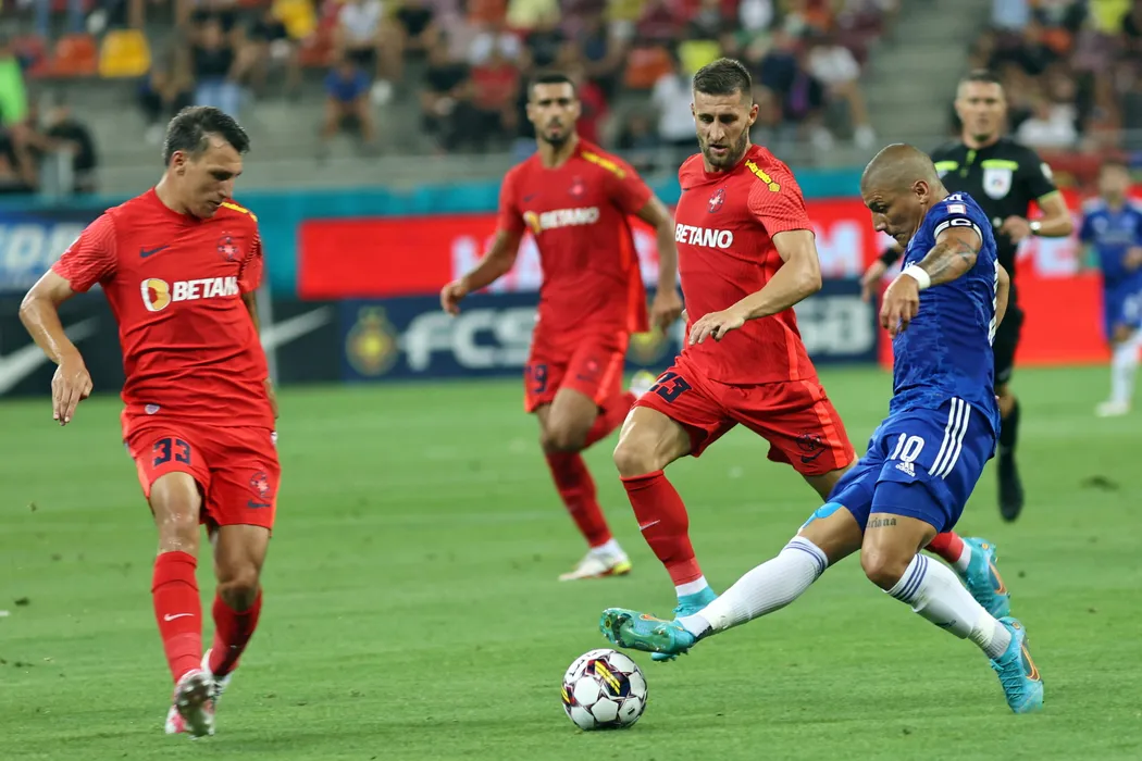 Risto Radunovic (S) si Ovidiu Popescu (C), de la FCSB, lupta pentru balon cu Juan Francisco Bauza(D), de la FC U Craiova 1948, in meciul de fotbal din etapa a III-a a Superligii, disputat pe Arena Nationala din Bucuresti, duminica, 31 iulie 2022. GEORGE FILIP / MEDIAFAX FOTO