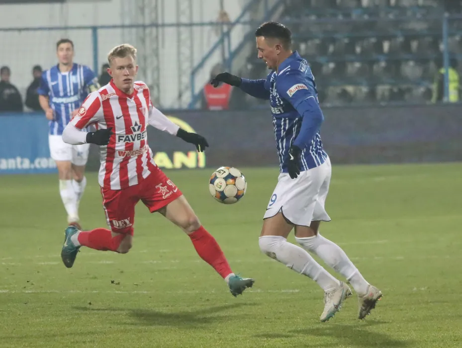 Jakub Vojtus si Denis Lucian Hrezdac in meciul de fotbal dintre Farul Constanta si UTA Arad, contand pentru Superliga Superbet, desfasurat pe Stadionul central al Academiei Gheorghe Hagi din Ovidiu, luni 15 decembrie 2025. © FOTO:Sorin Danielciuc/SPORT PICTURES