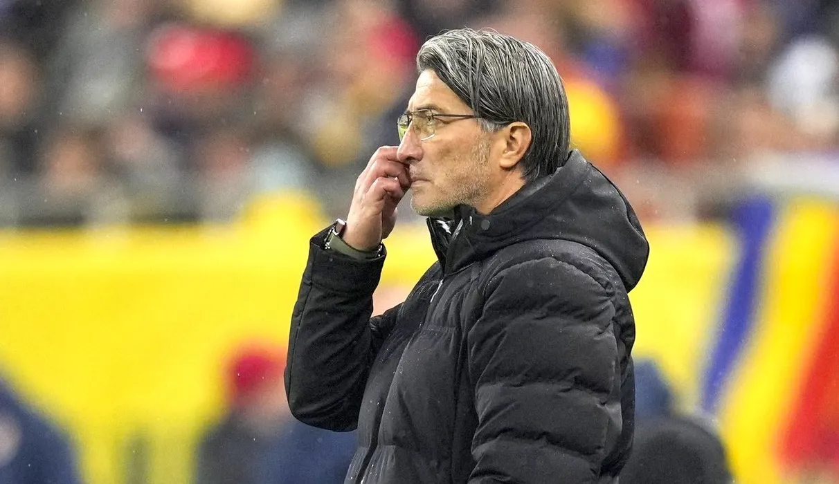 Switzerland's coach Murat Yakin touches his face during the Euro 2024, group I, qualifying soccer match between Romania and Switzerland at the National Arena stadium in Bucharest, Romania, Tuesday, Nov. 21, 2023.,Image: 823482237, License: Rights-managed, Restrictions: This content is intended for editorial use only. For other uses, additional clearances may be required., Model Release: no
