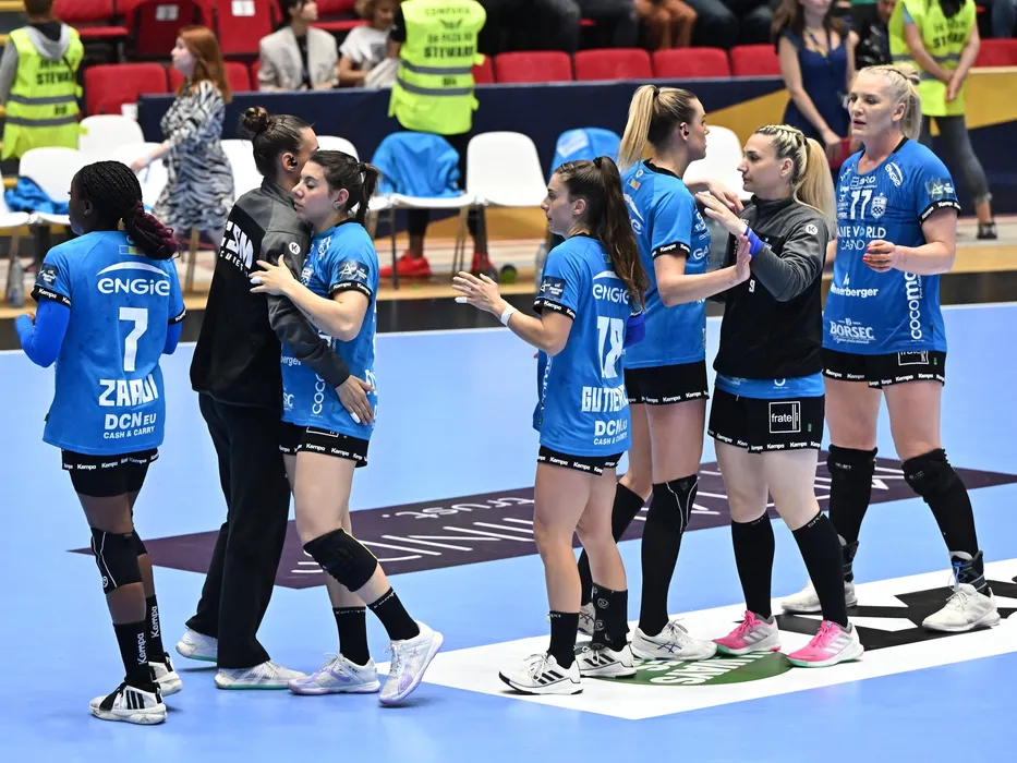 Handbalistele bucurestene Jennifer Maria Gutierez Bermejo, Laura Esther Ghislaine Flippes, Emilie Hegh Arntzen si Crina Elena Pintea se saluta dupa meciul de handbal feminin dintre CSM Bucuresti si Metz Handball, contand pentru Liga Campionilor, desfasurat in Sala Polivalenta-Ioan Kunst Ghermanescu din Bucuresti, duminica 28 aprilie 2024. Bucuresti *** Bucharest handball players Jennifer Maria Gutierez Bermejo, Laura Esther Ghislaine Flippes, Emilie Hegh Arntzen and Crina Elena Pintea greet each other after the womens handball match between CSM Bucharest and Metz Handball, a Champions League match, held in the Ioan Kunst Ghermanescu Polyvalent Hall in Bucharest, Sunday, April 28, 2024 Bucharest Copyright: xRazvanxPasarica/SPORTxPICTURESx,Image: 868778230, License: Rights-managed, Restrictions: Credit images as "Profimedia/ IMAGO", Model Release: no