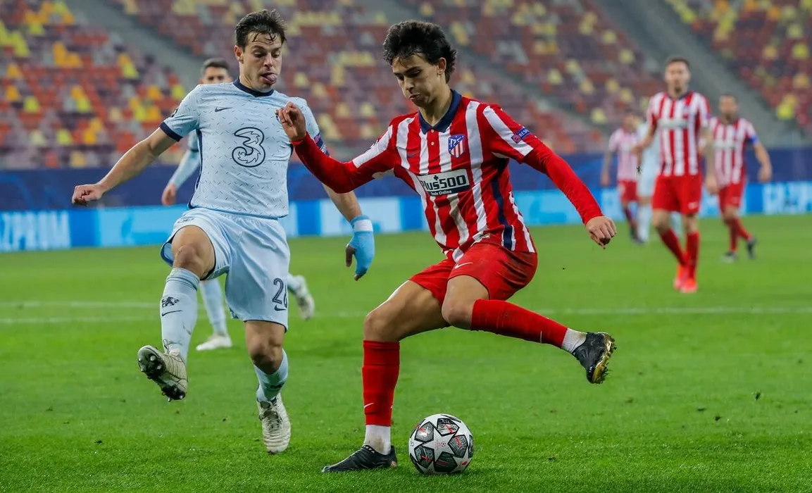 Atletico Madrid's Joao Felix, right, vies for the ball with Chelsea's Cesar Azpilicueta during the Champions League, round of 16, first leg soccer match between Atletico Madrid and Chelsea at the National Arena stadium in Bucharest, Romania, Tuesday, Feb. 23, 2021.,Image: 593007412, License: Rights-managed, Restrictions: This content is intended for editorial use only. For other uses, additional clearances may be required., Model Release: no, Pictured: Cesar Azpilicueta,Joao Felix