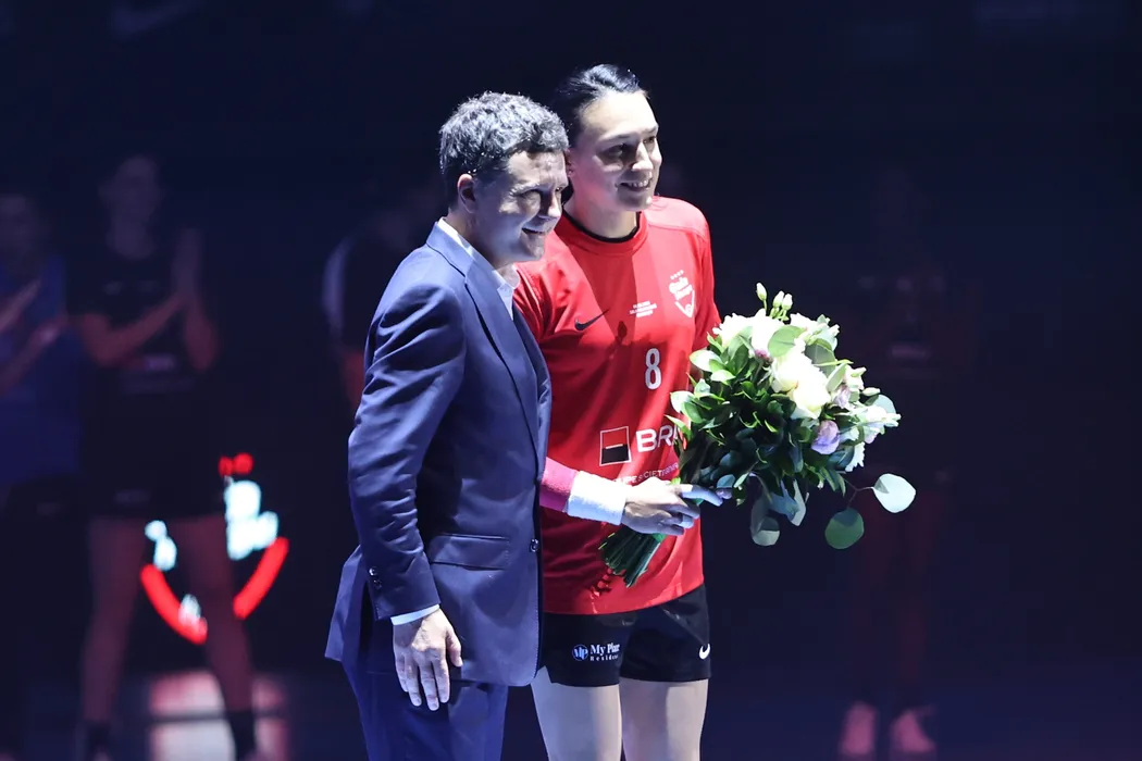 Cristina Neagu si Nicusor Dan la startul meciului de handbal feminin dintre Home Legends si World Stars, contand pentru Gala Neagu, eveniment care marcheaza retragerea Cristinei Neagu din handbal, desfasurat in Sala Polivalenta Ioan Kunst Ghermanescu din Bucuresti, dumincă 28 iunie 2025. © FOTO: Gheorghe Fluster/SPORT PICTURES