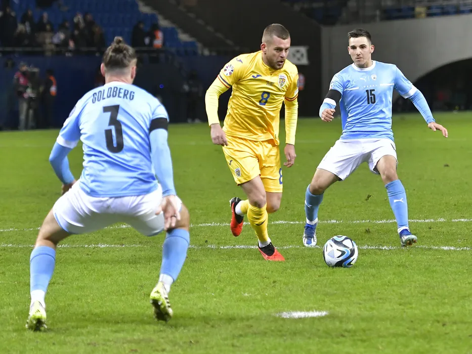Alexandru Cicaldau si Oscar Gloukh in meciul de fotbal dintre Israel si Romania, din cadrul preliminariilor Campionatului European 2024, desfasurat pe Puskás Akadémia Pancho Aréna din Felcsut, sambata 18 noiembrie 2023. © FOTO:Adrian Ecaterinescu/SPORT PICTURES