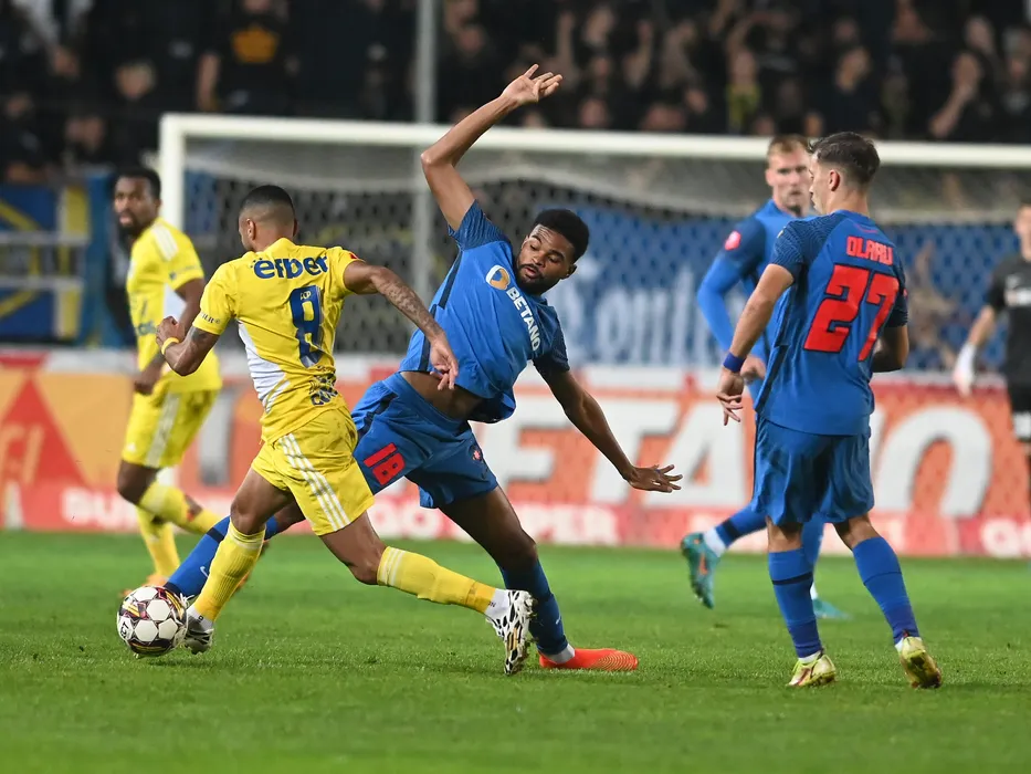 Jair Tavares Da Silva si Sylas Laouari Edjouma Malcom in meciul de fotbal dintre Petrolul Ploiesti si FCSB, contand pentru Superliga Superbet, desfasurat pe Stadionul Ilie Oana din Ploiesti, duminica 9 octombrie 2022. © FOTO:Razvan Pasarica/SPORT PICTURES