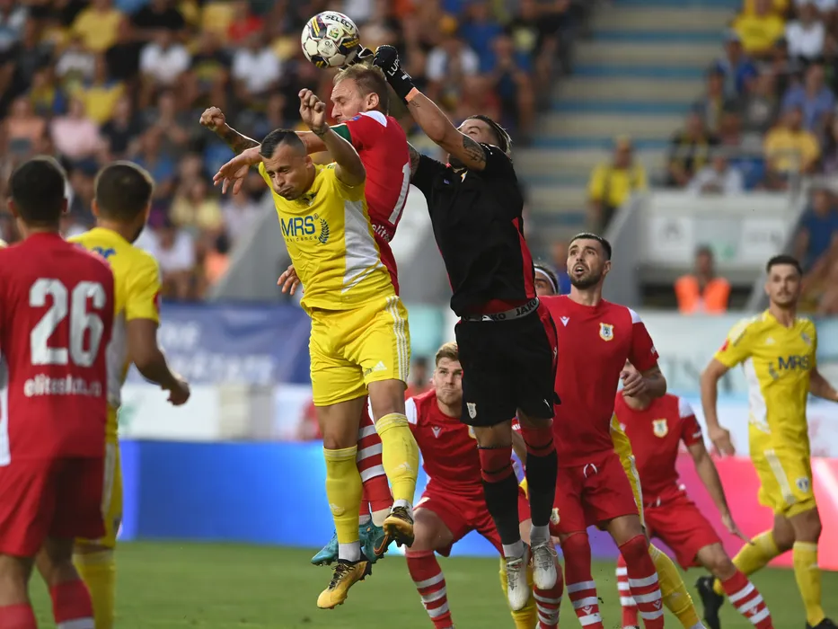 Mirko Ivanovski, Manuel Adrian Scarlatache si Ionut Balaur in meciul de fotbal dintre Petrolul Ploiesti si CS Mioveni, contand pentru Superliga Superbet, desfasurat pe Stadionul Ilie Oana din Ploiesti, sambata 27 august 2022. © FOTO:Razvan Pasarica/SPORT PICTURES