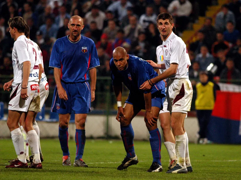 Dorel Mutica,Nana Falemi si George Galamaz in meciul de fotbal dintre Steaua Bucuresti si Rapid Bucuresti, din cadrul Diviziei A, desfasurat pe stadionul Steaua-Ghencea din Bucuresti, pe 21 aprilie 2004. © FOTO Razvan Pasarica/SPORT PICTURES