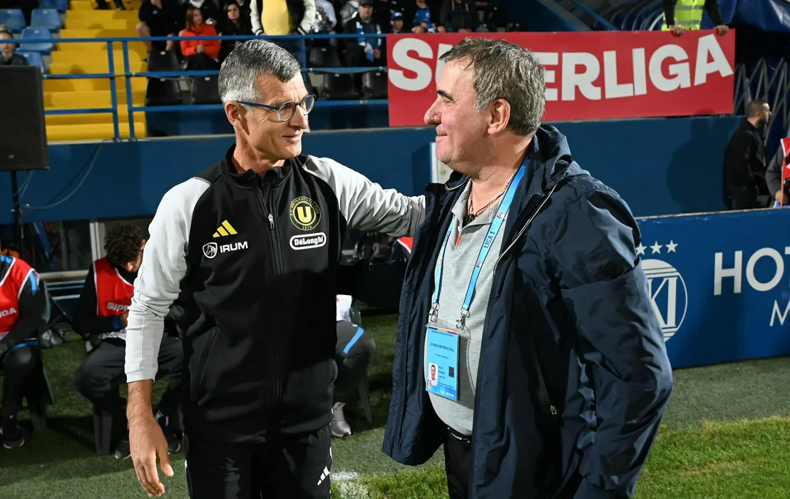 Cei doi antrenori Gheorghe Hagi si Ovidiu Ioan Sabau se saluta inaintea meciului de fotbal dintre Farul Constanta si Universitatea Cluj, contand pentru Superliga Superbet, desfasurat pe Stadionul central al Academiei Gheorghe Hagi din Ovidiu, sambata 21 octombrie 2023. © FOTO:Razvan Pasarica/SPORT PICTURES