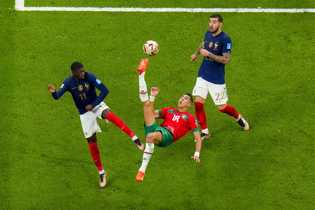 Morocco's Jawad El Yamiq, centre, attempts a shot at goal as France's Ousmane Dembele, left, and Theo Hernandez watch during the World Cup semifinal soccer match between France and Morocco at the Al Bayt Stadium in Al Khor, Qatar, Wednesday, Dec. 14, 2022. (AP Photo/Petr David Josek)