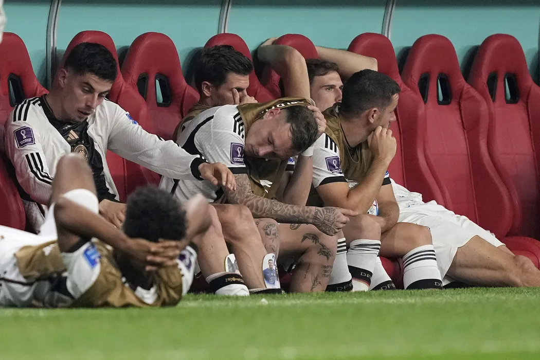German subs on the bench react after the World Cup group E soccer match between Costa Rica and Germany at the Al Bayt Stadium in Al Khor , Qatar, Thursday, Dec. 1, 2022. (AP Photo/Martin Meissner)