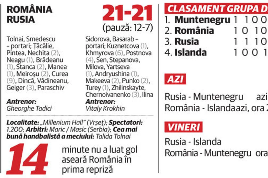 Naționala ratează o victorie uriașă!** Tolnai a fost fabuloasă! Rusia a recuperat 6 goluri! România-Rusia 21-21