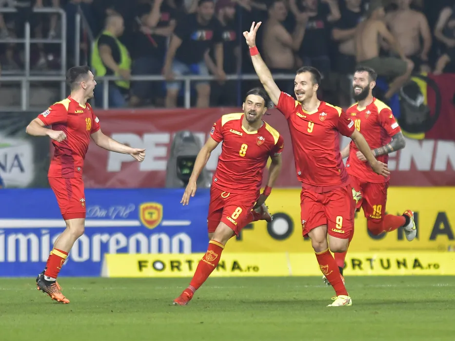 Bucurie a fotbalistilor muntenegreni dupa un gol marcat cu Vukan Savićević, Draško Božović, Stefan Mugoša si Aleksandar Šćekić la meciul de fotbal dintre Romania si Muntenegru, contand pentru Liga Natiunilor, desfasurat pe Stadionul Rapid Giulesti din Bucuresti, marti 14 iunie 2022. © FOTO:Razvan Pasarica/SPORT PICTURES