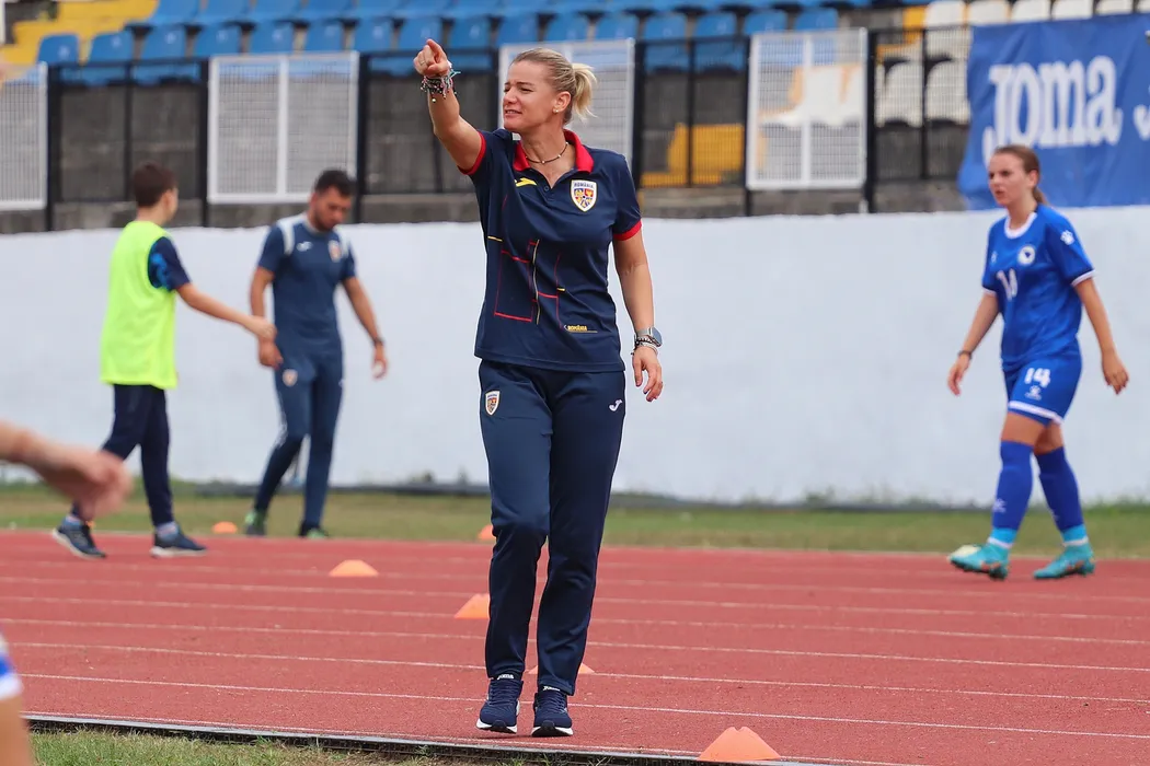 Nina Anca dand indicatii in meciul amical de fotbal feminin dintre ROMANIA U19 si BOSNIA HERTEGOVINA U19, desfasurat pe Stadionul Municipal "Cetate" din Alba Iulia, vineri 22 septembrie 2023. © FOTO:Valentin Macrea/SPORT PICTURES