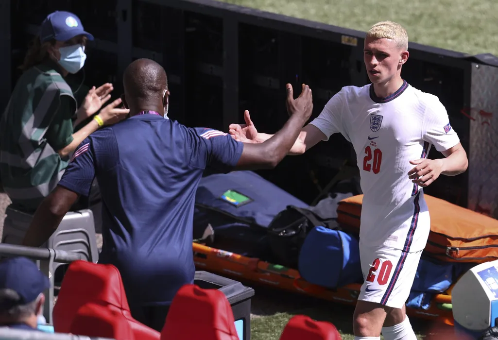 England's Phil Foden, right, gestures as he leaves the field during the Euro 2020 soccer championship group D match between England and Croatia at Wembley stadium in London, Sunday, June 13, 2021. (AP Photo/Catherine Ivill, Pool)