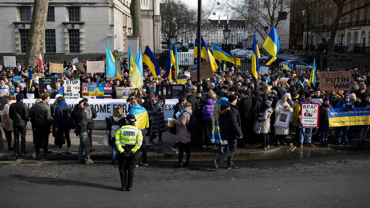 Pro Ukraine protesters gather outside Downing Street on the day that Russian president Vladimir Putin began a full-scale invasion of Ukraine.