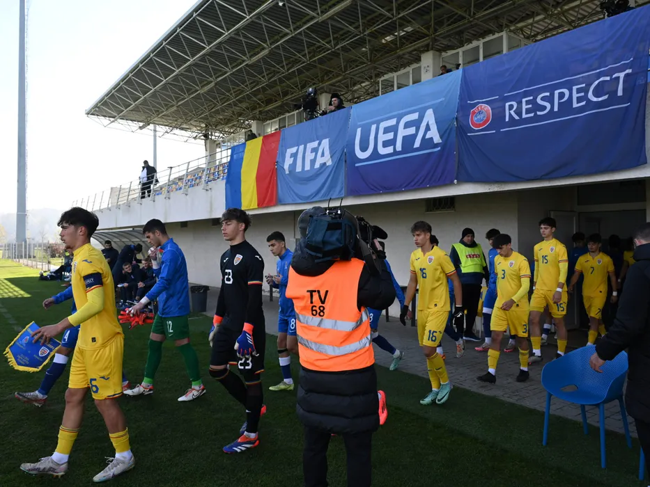 Fotbalistii romani Ianis Podoleanu, Răzvan Andrei Farcaș, Raul-Ionuț Alecsandroaie, Albert-Constantin Niculăesei si Raul Cojocariu la startul meciului de fotbal dintre Romania U17 si Azerbaidjan U17, contand pentru Preliminariile C.E 2025, desfasurat pe Terenul central al Centrului National de Fotbal de la Buftea, marti 19 noiembrie 2024. © FOTO:Razvan Pasarica/SPORT PICTURES