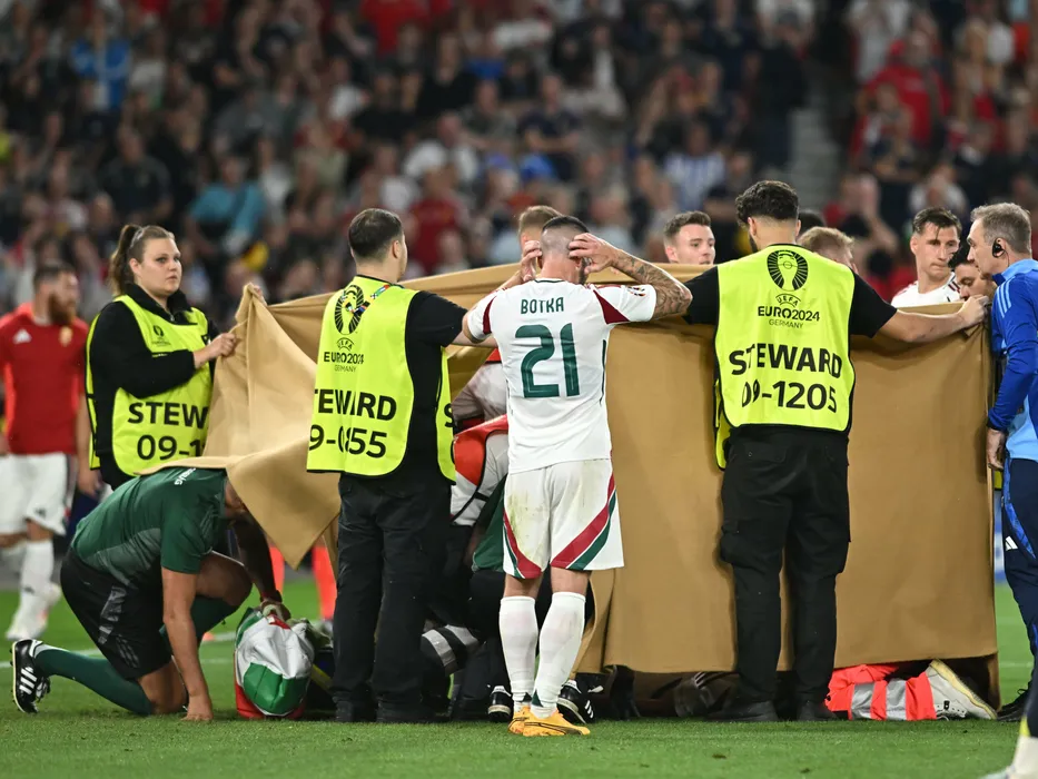Barnabás Varga primeste ingrijiri medicale dupa o accidentare avuta, protejat de paturi impotriva privirilor indiscrete in meciul de fotbal dintre Scotia si Ungaria, contand pentru UEFA EURO 2024, desfasurat pe Stuttgart Arena din Stuttgart, duminica 23 iunie 2024. © FOTO:Razvan Pasarica/SPORT PICTURES