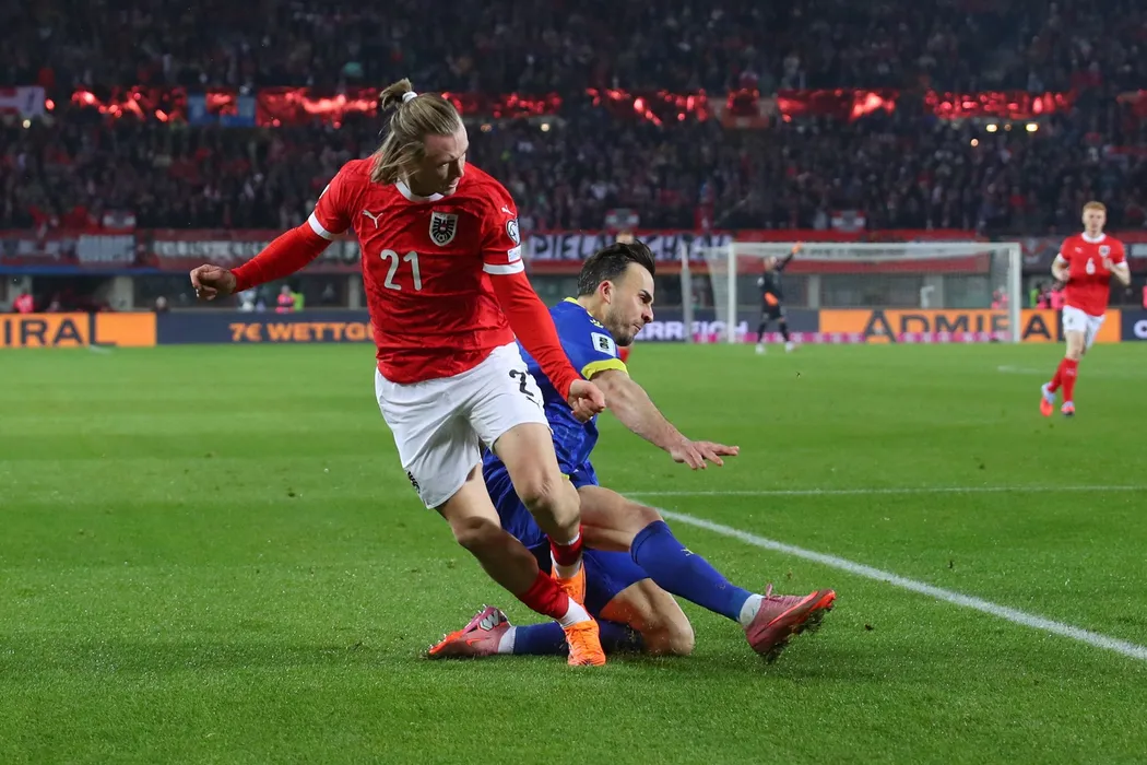 VIENNA, AUSTRIA - NOVEMBER 18: Patrick Wimmer of Austria and Haris Tabakovic of Bosnia and Herzegovina during the FIFA World Cup 2026 European Qualifier Group H match between Austria and Bosnia and Herzegovina at Ernst Happel Stadion on November 18, 2025 in Vienna, Austria .251118_SEPA_07_011 - 20251118_PD9628,Image: 1053176391, License: Rights-managed, Restrictions: AUSTRIA OUT, GERMANY OUT, SWITZERLAND OUT, UK OUT
