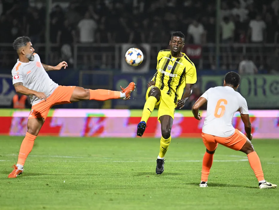Sousa Junior Morais Iraneuton si Vhakka Eddy Stelh Gnahore in meciul de fotbal dintre Metaloglobus Bucuresti si Dinamo Bucuresti, contand pentru Superliga Superbet, desfasurat pe Clinceni Arena din Clinceni, vineri 8 august 2025. © FOTO:Razvan Pasarica/SPORT PICTURES