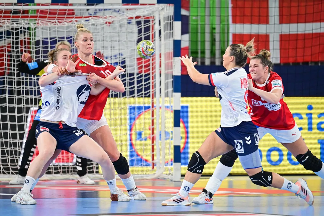 Norway's Vilde Mortensen Ingstad (L) and Nora Mork (2R) fight for the ball with Denmark's Kathrine Brothmann Heindahl (2L) and Rikke Iversen (R) during the Women's EHF Handball European Championship EURO 2022 main round match between Norway and Denmark at the Arena Stozice in Ljubljana, on November 16, 2022.,Image: 738053672, License: Rights-managed, Restrictions: , Model Release: no