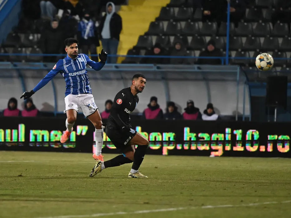 Ionuț Daniel Vână marchează un gol de lângă Screciu Vladimir Ionuț in meciul de fotbal dintre Farul Constanta si Universitatea Craiova, contand pentru Superliga Superbet, desfasurat pe Stadionul central al Academiei Gheorghe Hagi din Ovidiu, duminica 1 februarie 2026. © FOTO:Razvan Pasarica/SPORT PICTURES