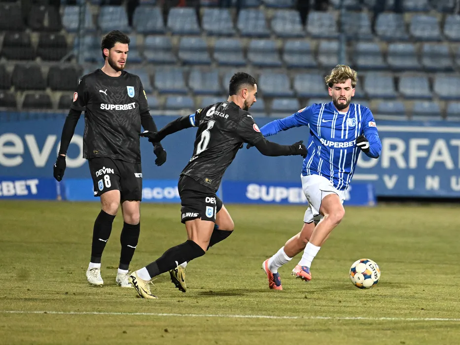 Tudor Cristian Baluta, Screciu Vladimir Ionuț si Diogo Sa Ramalho in meciul de fotbal dintre Farul Constanta si Universitatea Craiova, contand pentru Superliga Superbet, desfasurat pe Stadionul central al Academiei Gheorghe Hagi din Ovidiu, duminica 1 februarie 2026. © FOTO:Razvan Pasarica/SPORT PICTURES
