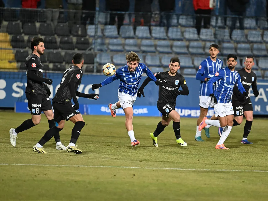 Tudor Cristian Baluta, Diogo Sa Ramalho, Anzor Mekvabishvili si Ionuț Daniel Vână in meciul de fotbal dintre Farul Constanta si Universitatea Craiova, contand pentru Superliga Superbet, desfasurat pe Stadionul central al Academiei Gheorghe Hagi din Ovidiu, duminica 1 februarie 2026. © FOTO:Razvan Pasarica/SPORT PICTURES