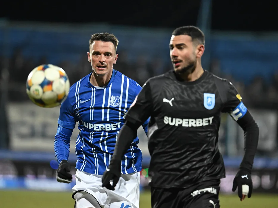 Jakub Vojtus si Screciu Vladimir Ionuț in meciul de fotbal dintre Farul Constanta si Universitatea Craiova, contand pentru Superliga Superbet, desfasurat pe Stadionul central al Academiei Gheorghe Hagi din Ovidiu, duminica 1 februarie 2026. © FOTO:Razvan Pasarica/SPORT PICTURES