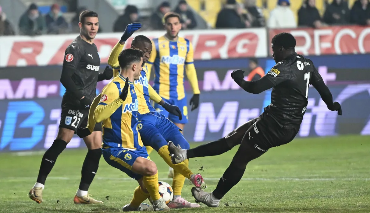 Samuel Teles Pereira Nunes Da Silva, Danel Jordan Dongmo, Miranda Ricardo Jose Veiga Varzim si Aime Steven Nsasa Nsimba Labe in meciul dintre Petrolul Ploiesti si Universitatea Craiova, contand pentru Superliga Superbet, desfasurat pe Stadionul Ilie Oana din Ploiesti, luni 19 ianuarie 2026. © FOTO:Razvan Pasarica/SPORT PICTURES