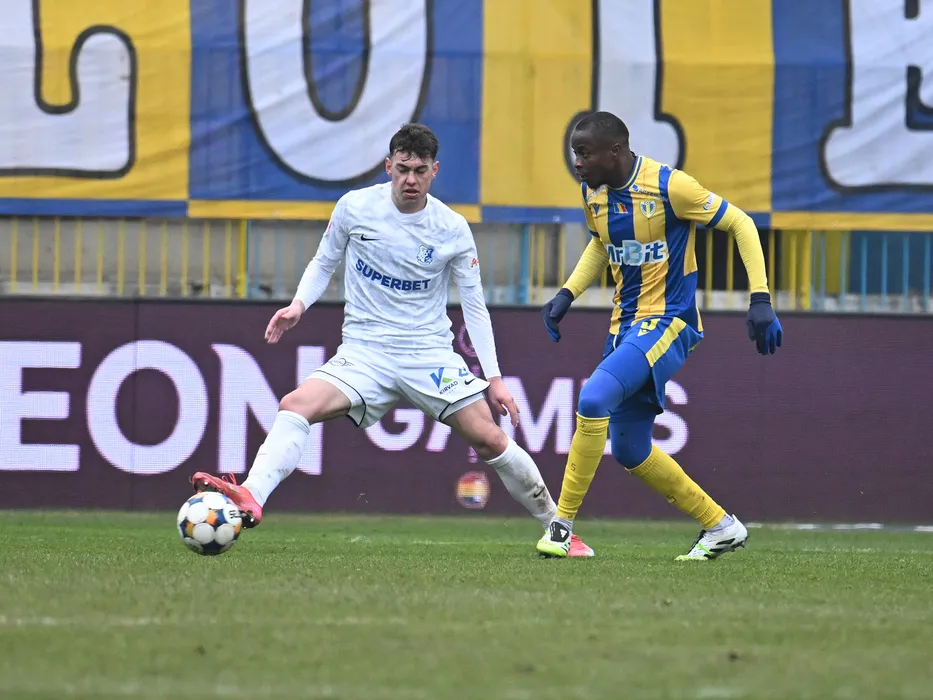 Eduard Gabriel Radaslavescu si Danel Jordan Dongmo in meciul de fotbal dintre Petrolul Ploiesti si Farul Constanta, contand pentru Superliga Superbet, desfasurat pe Stadionul Ilie Oana din Ploiesti, duminica 25 ianuarie 2026. © FOTO:Razvan Pasarica/SPORT PICTURES