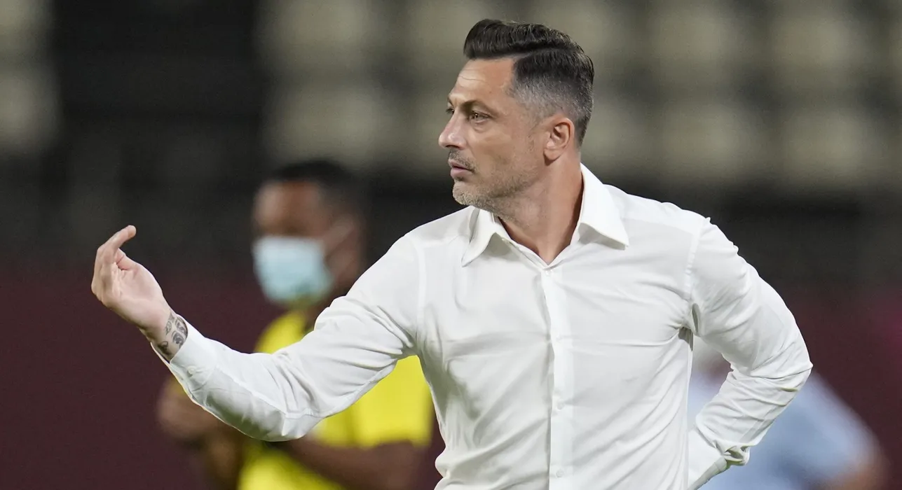 Coach Mirel Radoi of Romania gives instructions to his his players during a men's soccer match against South Korea at the 2020 Summer Olympics, Sunday, July 25, 2021, in Kashima, Japan. (AP Photo/Fernando Vergara)