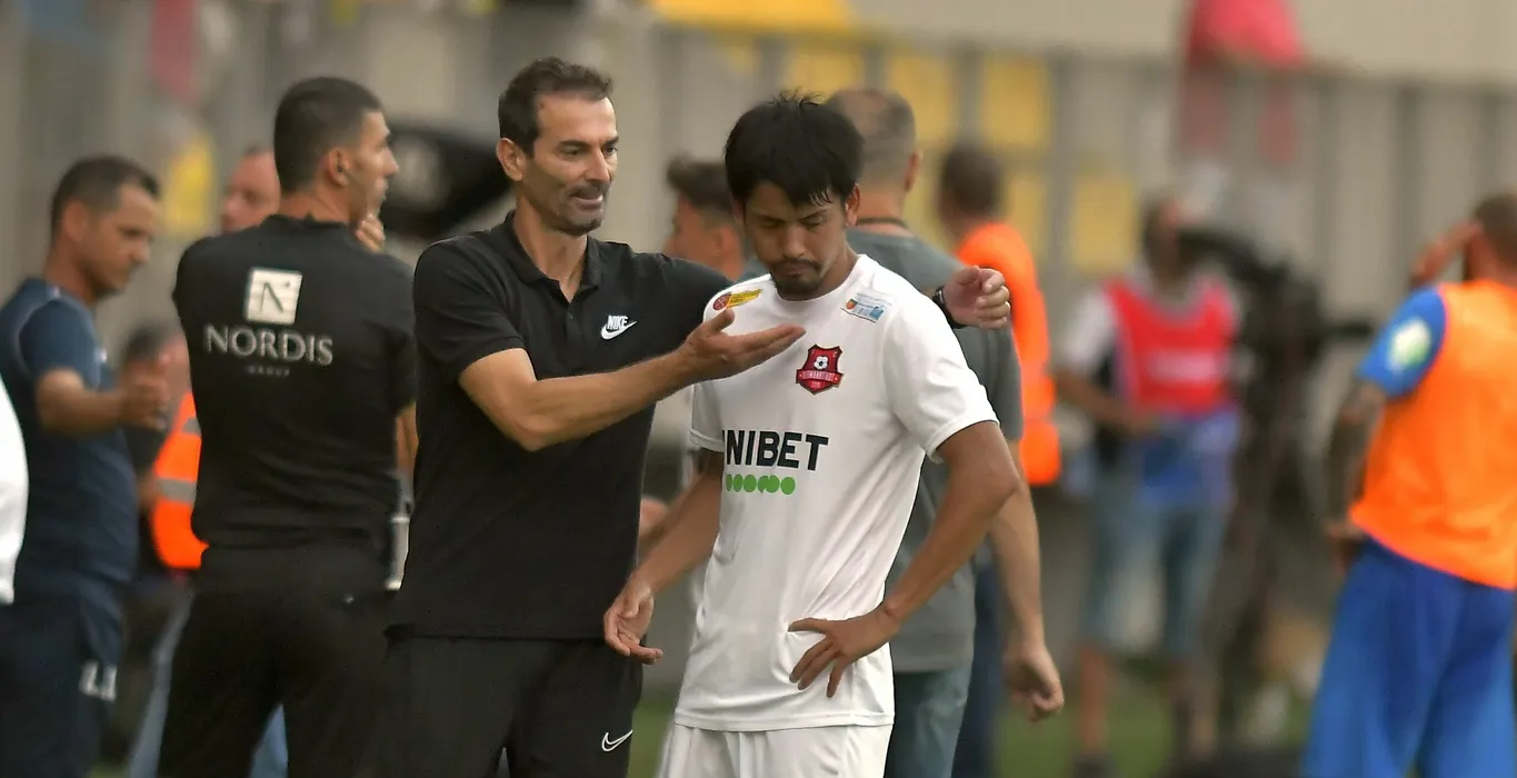 Marius Maldarasanu discuta cu Mino Sota dupa meciul de fotbal dintre Chindia Targoviste si FC Hermannstadt, contand pentru Superliga Superbet, desfasurat pe Stadionul Ilie Oana din Ploiesti, luni 25 iulie 2022. © FOTO:Razvan Pasarica/SPORT PICTURES