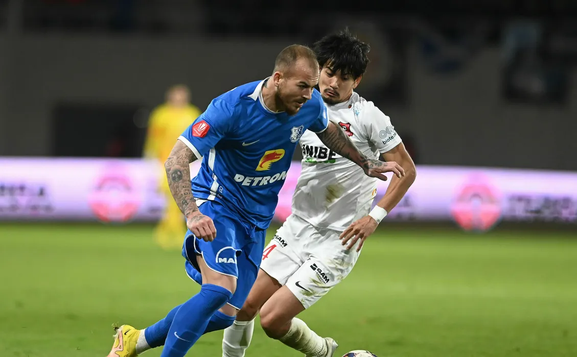 Denis Alibec si Mino Sota in meciul de fotbal dintre FC Hermannstadt si Farul Constanta, contand pentru Superliga Superbet, desfasurat pe Stadionul Municipal din Sibiu, sambata 10 decembrie 2022. © FOTO:Razvan Pasarica/SPORT PICTURES