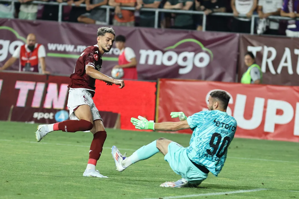 Albion Rrahmani și Răzvan Sergiu Sava în meciul de fotbal dintre FC Rapid 1923 București și FC CFR 1907 Cluj, contând pentru Superliga Superbet, desfășurat pe Stadionul Superbet Arena - Giulești din București, sâmbătă 20 iulie 2024. © FOTO: Gică FLUȘTER/SPORT PICTURES