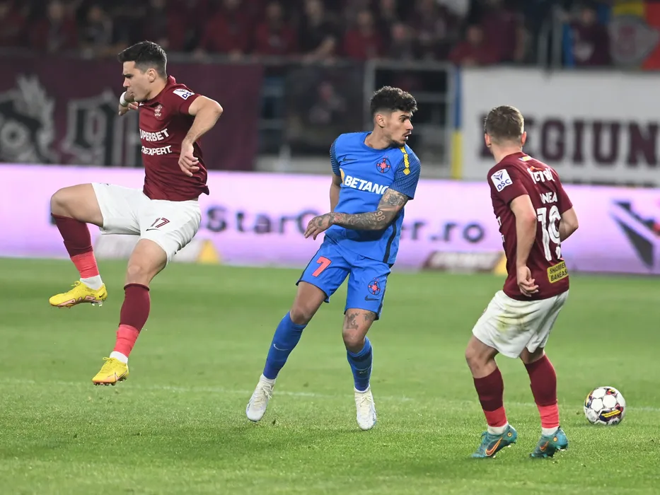 Stefan Calin Panoiu si Florinel Teodor Coman in meciul de fotbal dintre Rapid Bucuresti si FCSB, contand pentru Play-off-ul Superligii Superbet, desfasurat pe Stadionul Rapid Giulesti din Bucuresti, duminica 23 aprilie 2023. © FOTO:Razvan Pasarica/SPORT PICTURES