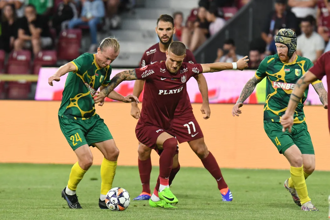 George Daniel Bîrligea, Panagiotis Tachtsidis și Andrey Yakimov, Andrey Vasilyev în meciul de fotbal dintre FC CFR 1907 Cluj si FC Neman Grodno, contând pentru Turul 2 de calificare Conference League, desfășurat pe Stadionul Dr.Constantin Rădulescu din Cluj-Napoca, joi 25 iulie 2024. © FOTO: Flaviu BUBOI/SPORT PICTURES