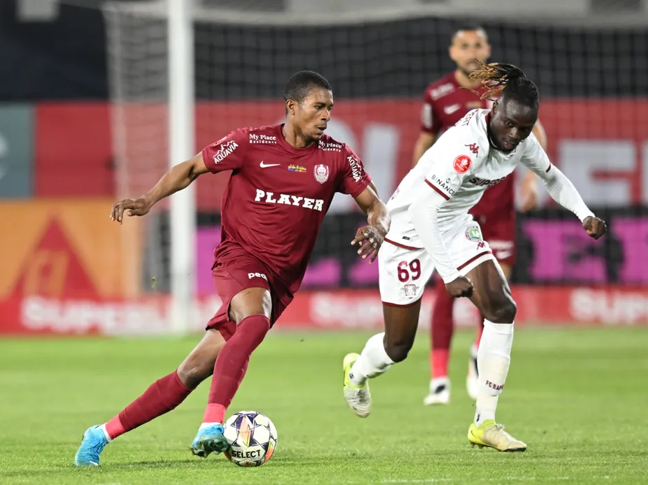 Mohammed Kesselly Kamara si Peter Oluwaseun Ademo in meciul de fotbal dintre FC CFR 1907 Cluj si FC Rapid 1923 Bucuresti, contand pentru Superliga Superbet - Play-Off, desfasurat pe Stadionul Dr.Constantin Radulescu din Cluj-Napoca, luni 14 aprilie 2025. © FOTO: Flaviu Buboi/SPORT PICTURES