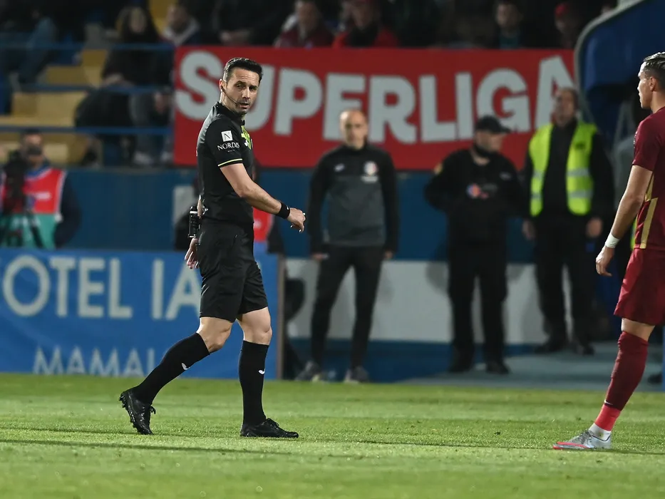 Arbitrul central Sebastian Coltescu reactioneaza in meciul de fotbal dintre Farul Constanta si CFR Cluj, contand pentru Play-off-ul Superligii Superbet, desfasurat pe Stadionul central al Academiei Gheorghe Hagi din Ovidiu, sambata 22 aprilie 2023. © FOTO:Razvan Pasarica/SPORT PICTURES