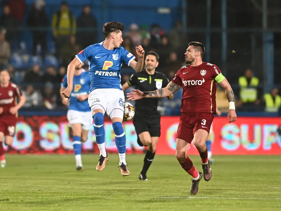 Adrian Mazilu si Andonie Andrei Burca in meciul de fotbal dintre Farul Constanta si CFR Cluj, contand pentru Play-off-ul Superligii Superbet, desfasurat pe Stadionul central al Academiei Gheorghe Hagi din Ovidiu, sambata 22 aprilie 2023. © FOTO:Razvan Pasarica/SPORT PICTURES